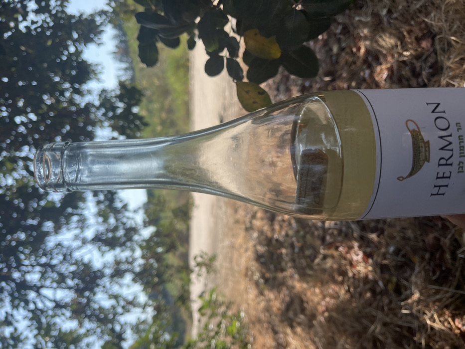 A clear glass bottle, partially filled with a light yellow liquid and containing a cork floating within, is held by a hand in an outdoor setting in Kfar Vitkin, Israel. The bottle's white label displays "HERMON" in black capital letters, a golden ancient lamp emblem, and Hebrew text reading "הר חרמון לבן" (Mount Hermon White). The background is blurred, showing dappled sunlight filtering through green foliage on the left and upper sections, dry brown ground cover, and an open, lighter-toned field or expanse with distant greenery under bright daylight.