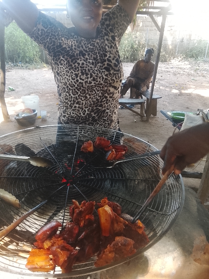 The image captures an outdoor cooking scene in Lafia, Nigeria, under bright daylight conditions