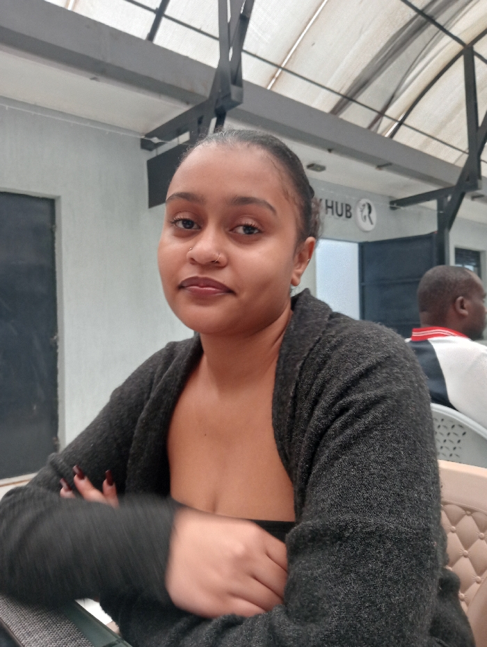 A young woman with dark hair pulled back, wearing a gray cardigan, sits with her arms crossed. She has a nose ring and is looking directly at the camera with a slight smile. Behind her, a man is partially visible, wearing a white and red shirt. The setting appears to be an indoor area, possibly a cafe, with a ceiling structure featuring metal beams. A sign with "HUB" is visible in the background.