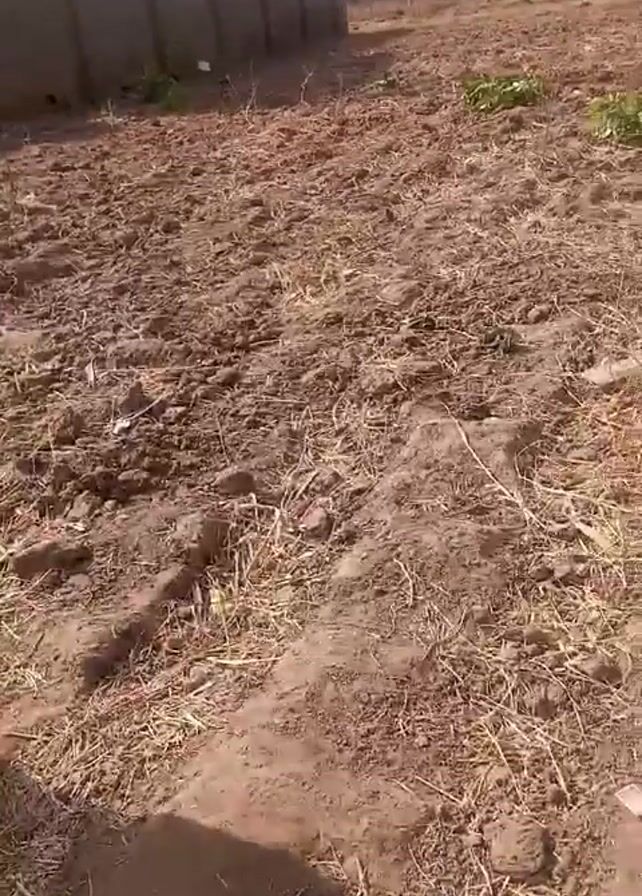 The video depicts a young child standing in a dirt field. The child is wearing a blue shirt and camo pants, and has their hair in braids. The child is speaking, although the audio is unclear. In the background, there is an adult wearing an orange shirt and patterned pants, walking away from the camera carrying a bag. The field is dry and covered in patches of dead grass. In the distance, there are buildings and a fence. The scene is bathed in sunlight, casting shadows.