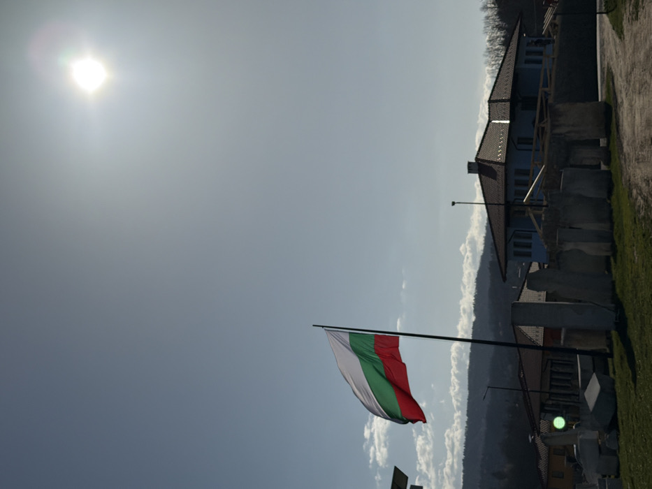 An outdoor, daytime, wide-angle shot depicts a Bulgarian flag flying on a black flagpole, positioned left of the frame's vertical center