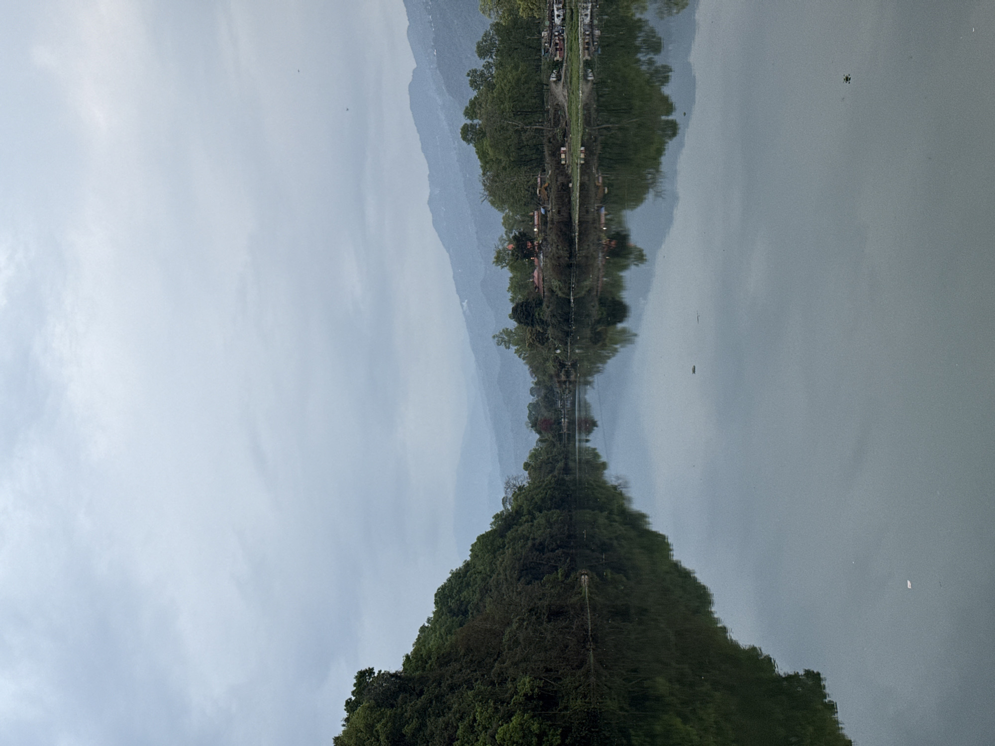 The image displays a wide, static view of Phewa Lake in Pokhara, Nepal, under an overcast sky. The upper third of the frame is dominated by a uniform, light grey cloud cover, with two small, dark specks, likely birds, visible in the upper right quadrant. The central and lower portions depict the calm surface of the lake, exhibiting near-perfect reflections of the surrounding landscape and sky. Several small pieces of debris are visible floating on the water's surface, including a white, rectangular object in the lower left quadrant. The left bank of the lake features a steep, densely vegetated hill covered in dark green trees and foliage that extends directly to the water's edge. This forested slope is mirrored clearly in the lake. The right bank presents a more developed shoreline. A cluster of trees with lighter green foliage stands behind a small settlement. Prominently visible is a structure with a distinctive red-orange element, possibly a roof or banner, indicative of a temple or religious building. Several other smaller structures, resembling houses or shacks, are scattered along this bank, interspersed with disturbed ground and what appears to be construction-related materials. In the background, beyond the immediate shores, multiple layers of mountains or hills recede into the distance. These distant ranges appear hazy and blue-grey, consistent with atmospheric perspective under an overcast sky. No individuals or specific actions are discernible. The scene is devoid of overt human interaction.