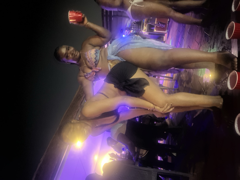 At an outdoor party, two women in swimwear pose together. One woman, with dark skin and short hair, holds a red cup above her head. The other woman, with light skin and blonde hair, holds her partner's hands. Other individuals and red cups are seen in the background. The scene is lit by purple and yellow lights, creating a vibrant and festive atmosphere.