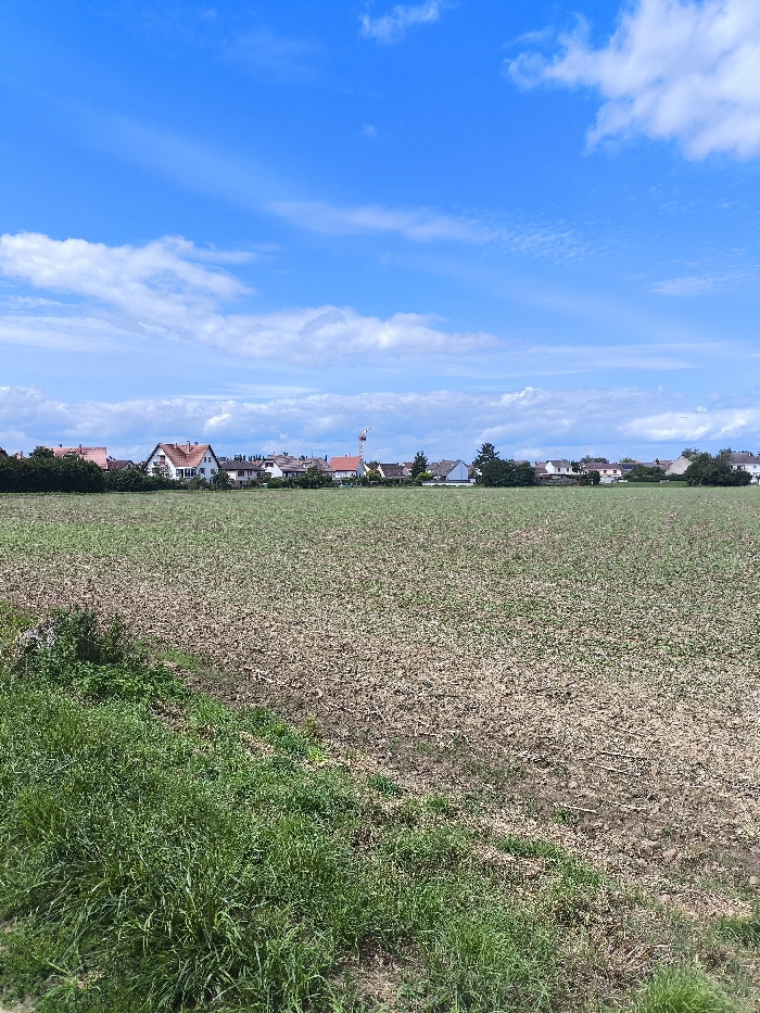 The image presents an open field bordering a residential area in Oberschaeffolsheim, France, under a bright blue sky with scattered white cumulus clouds