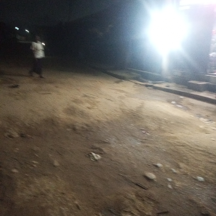 This image depicts a nighttime scene in Lugbe, Nigeria, characterized by low illumination and a dominant bright artificial light source