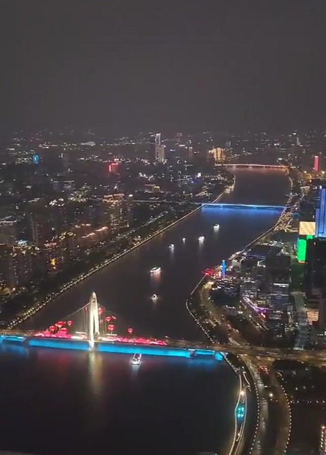 nighttime cityscape with a river running through it. The camera is positioned high above the ground, presumably from a tall building, looking out over the city. A bridge is visible in the foreground, illuminated with blue and red lights. Several boats are moving along the river. The city skyline is dotted with skyscrapers, all lit up, creating a vibrant display of light. In the distance, another bridge spans the river. A railing is visible in the lower left corner, suggesting the video was taken from a balcony or observation deck.