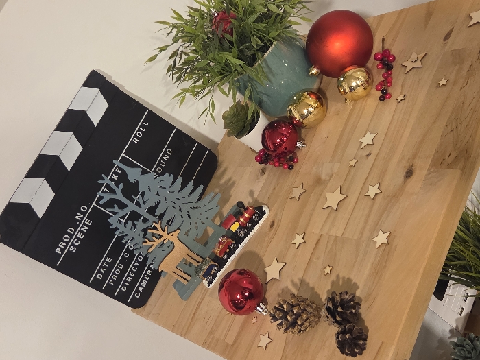 A clapperboard rests beside a wooden surface adorned with Christmas ornaments