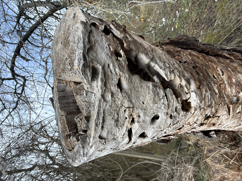 This image captures a close-up of a severely weathered and decaying tree stump in Dolna Sekirna, Bulgaria. The top of the stump is hollowed, revealing fractured, rough wood fragments within its basin. The outer surface of the stump's trunk is greyish-brown, heavily textured with deep fissures, and pockmarked by numerous irregular boreholes and larger cavities, indicative of advanced decomposition or insect activity. Towards the base, remnants of bark are visible, appearing to peel and flake. In the background, a dense network of bare, dark tree branches against a pale blue sky suggests a dormant season. A section of a wire fence is visible to the mid-left, partially obscured by dry vegetation. Dry, light-colored grass and brush are present around the base of the stump. No individuals or active subjects are depicted.