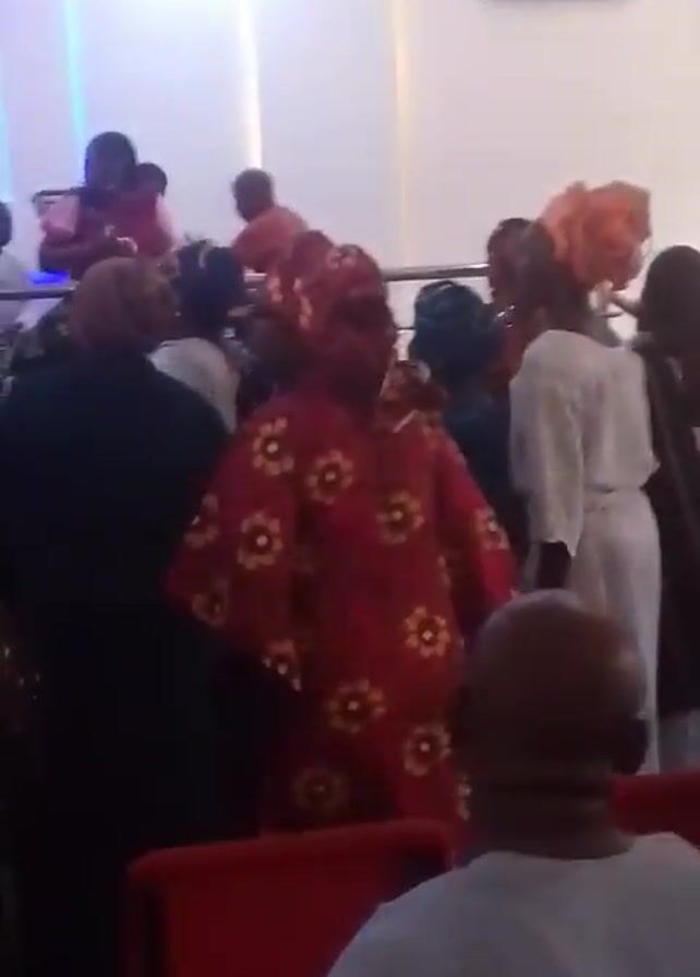 gathering of people indoors, likely in a church or similar venue. The camera moves, offering glimpses of attendees, many of whom are women wearing traditional head coverings. Some people are standing and moving around. Wall posters with religious themes are visible. The lighting is bright.
