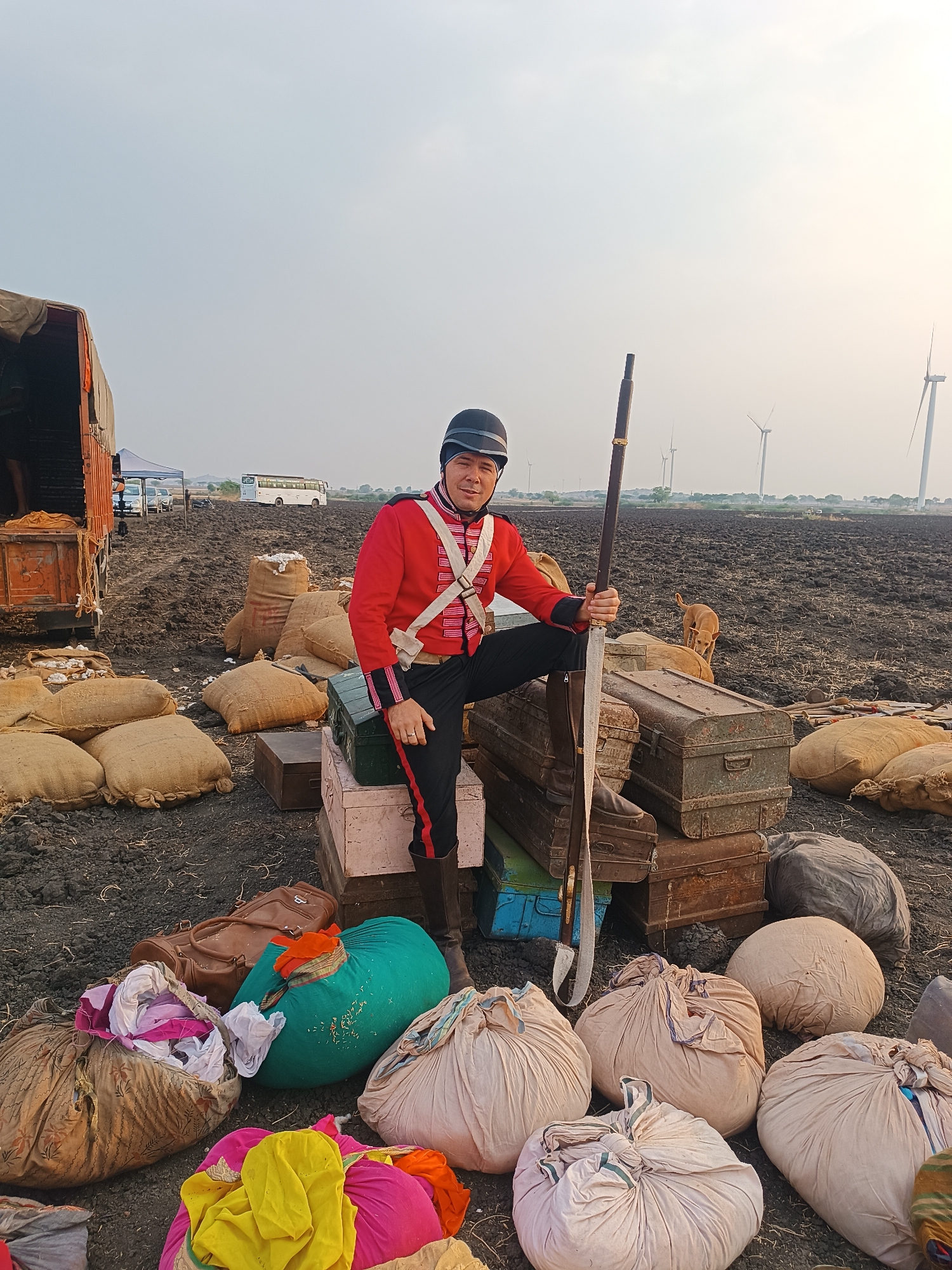 An outdoor scene in Kottalapalli, India, displays a male subject in a historical military uniform posed in a dark, cultivated field under an overcast sky