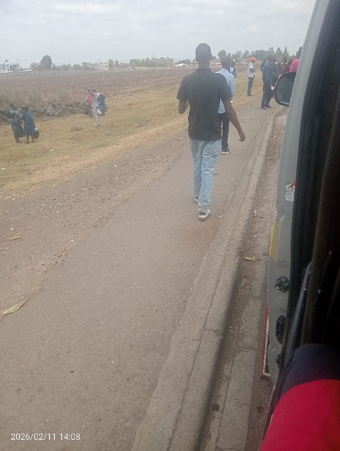 The image depicts an outdoor scene along a paved road under an overcast sky, located in the city of Unknown, Unknown, dated 2026/02/11 14:08. The photograph is taken from the interior of a vehicle, with a portion of its door frame, a side mirror, and a red-clad leg visible on the far right. A paved asphalt road runs from the foreground into the distance, with a concrete curb separating it from a dirt shoulder on the right. On the road, a male subject with a dark complexion, wearing a black short-sleeved t-shirt, light blue jeans, and light-colored sneakers, walks away from the camera. Behind him, another male subject in a light-colored shirt is visible. Further down the road, a group of approximately 5-7 individuals stands on or adjacent to the road shoulder, observing towards the left. To the left of the road, an expansive, dry, uncultivated field stretches into the background. Within this field, a group of approximately 4-5 individuals, some appearing to be women carrying bundles or bags, are situated. One male figure is visible near a parked motorcycle, extending his right arm in a gesturing motion. In the distant background, a white multi-story building is discernible on the far left, with indistinct structures and trees visible along the horizon.