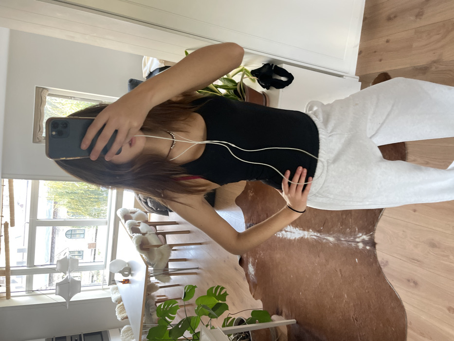 An interior mirror selfie captures a young female subject within a contemporary residence in Copenhagen, Denmark. The subject stands centrally, holding a dark-colored smartphone to photograph her reflection, with her left hand obscuring her face and her right hand on her hip. She wears a black tank top, revealing a red bra strap on her left shoulder, and light grey sweatpants. Wired white earbuds are draped around her neck, connecting to the phone, and she has a black beaded necklace and a black hair tie on her right wrist. The reflected background reveals a well-lit living space. The floor is composed of light wooden planks, partially covered by a large, irregular-shaped brown and white animal hide rug. A white rectangular dining table, adorned with a dark vase and a white spherical object, is positioned under a large window. Six wooden chairs with white furry seat covers are arranged around the table. Multiple white, layered pendant lamps hang above the dining area. Beyond the window, green foliage and light-colored urban buildings are visible, consistent with a city environment. To the left, a potted Monstera plant rests on a white stand. A dark sofa or armchair with a cream-colored throw is partially visible in the mid-ground, and another potted plant with green and yellow leaves is on the right side of the frame.