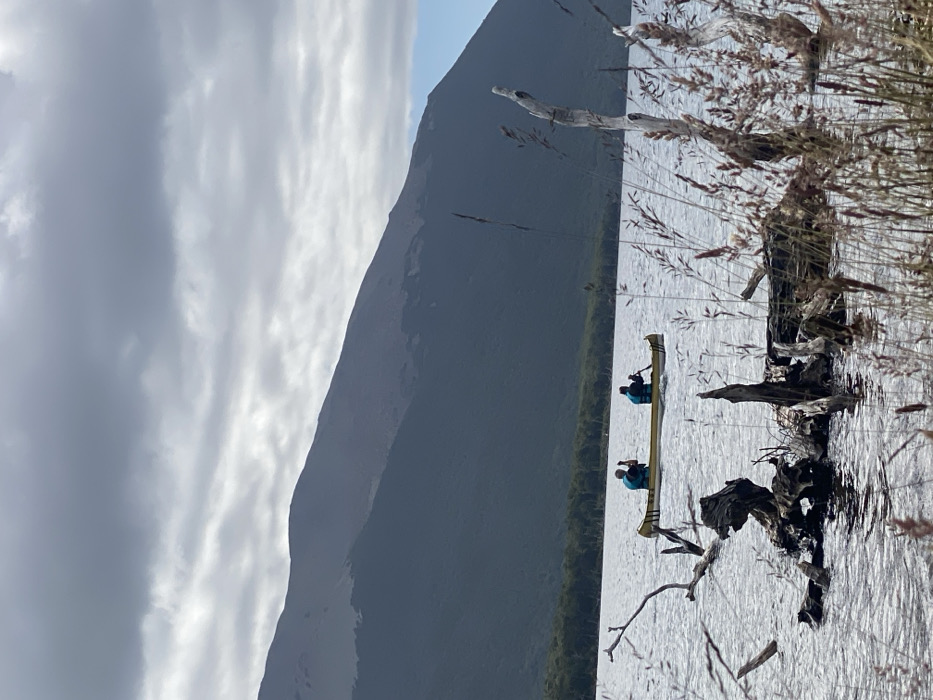 A landscape shot features a still body of water with ripples, reflecting light. Two people paddle a long, yellow canoe in the center. A large, gray mountain dominates the background, partially obscured by overcast skies. Dried grasses and fallen tree branches fill the right side of the frame. The composition is slightly askew, giving a sense of movement.