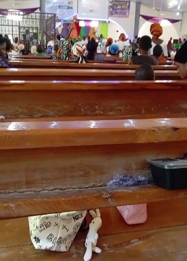 interior of a church filled with people sitting in wooden pews. The camera is positioned behind the pews, offering a view of the congregation facing forward. There are balloons hanging from the ceiling, and items are left on the pews, including a small bag with baby words on it and a stuffed bunny. The general atmosphere indicates a gathering or event taking place within the church.