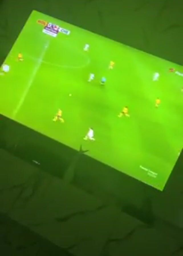 A close-up shot shows a TV screen displaying a soccer game