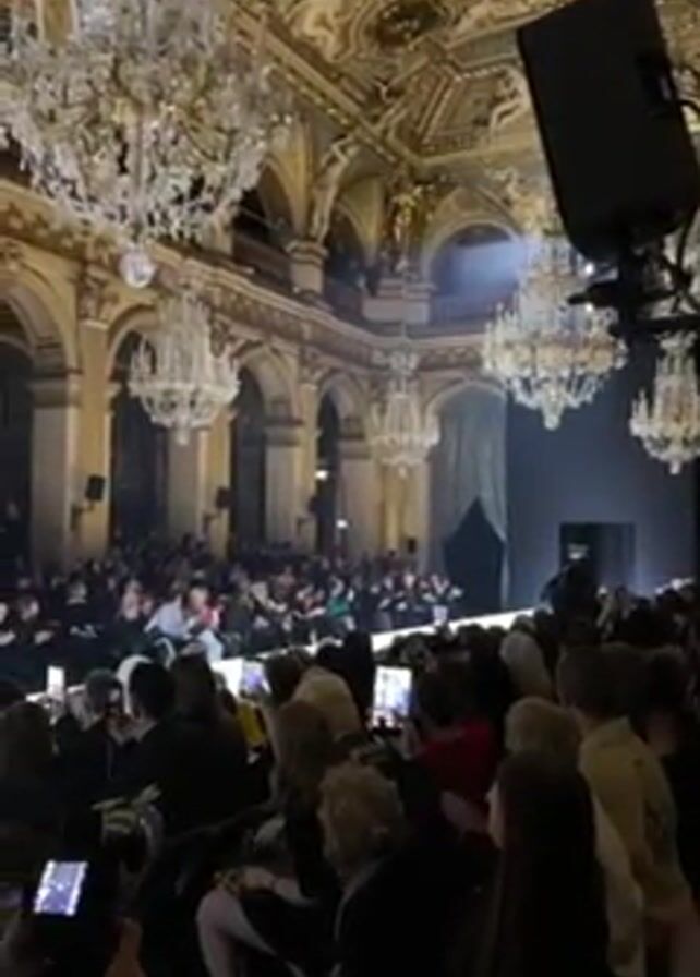 The video captures a fashion show inside a grand, ornate hall