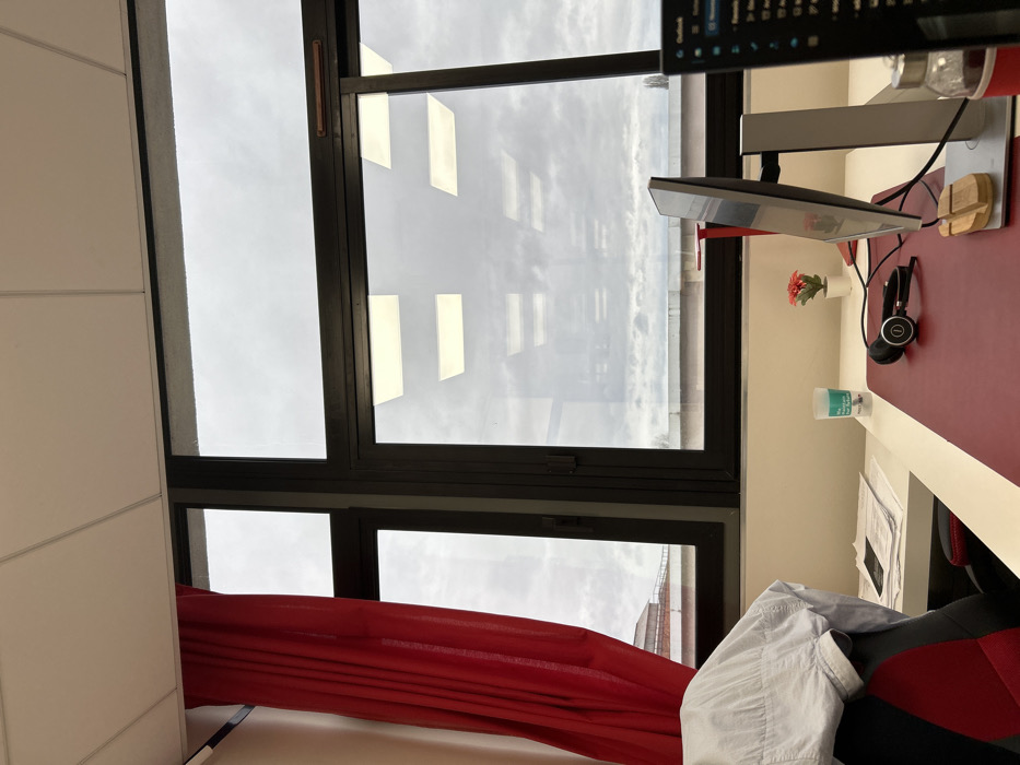 The image displays an interior office workspace, located in Strasbourg, France, viewed from a seated perspective looking towards a large window on an overcast day. In the foreground, a red and black office chair is partially visible on the left, draped with a light blue collared shirt. A white desk surface occupies the lower half of the frame, holding a stack of papers, a translucent cup, a small potted plant with red blooms, and a pair of black over-ear headphones. A computer monitor with a silver stand is positioned centrally on the desk, resting on a reddish-brown mat. The right edge of a second monitor, displaying an email client interface, and a red insulated bottle are partially visible. The majority of the background is filled by the dark grey-framed window, which reflects rectangular interior light fixtures. Beyond the window, a grey, cloudy sky is visible, with distant industrial-style buildings featuring reddish roofs and a concrete ledge running horizontally across the mid-ground. A red curtain hangs along the left side of the window frame. No individuals, direct actions, or interactions are present in the scene.