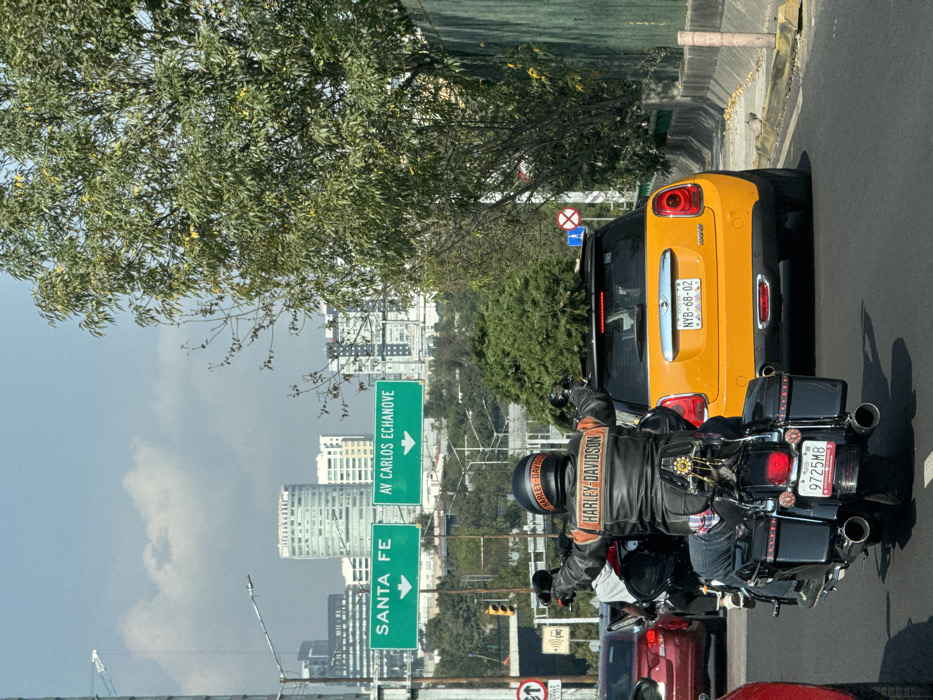 A Harley-Davidson motorcycle sits behind a yellow Mini Cooper on a city street. The motorcycle's license plate reads "9725M8." The Mini Cooper has a license plate "NYB-68-02." Street signs indicate directions to "Santa Fe" and "Av Carlos Echanove." A rider, wearing a black leather Harley-Davidson jacket and helmet, is on the motorcycle. Tall buildings and trees are visible in the background, suggesting an urban environment. The scene is captured from a slightly elevated perspective.