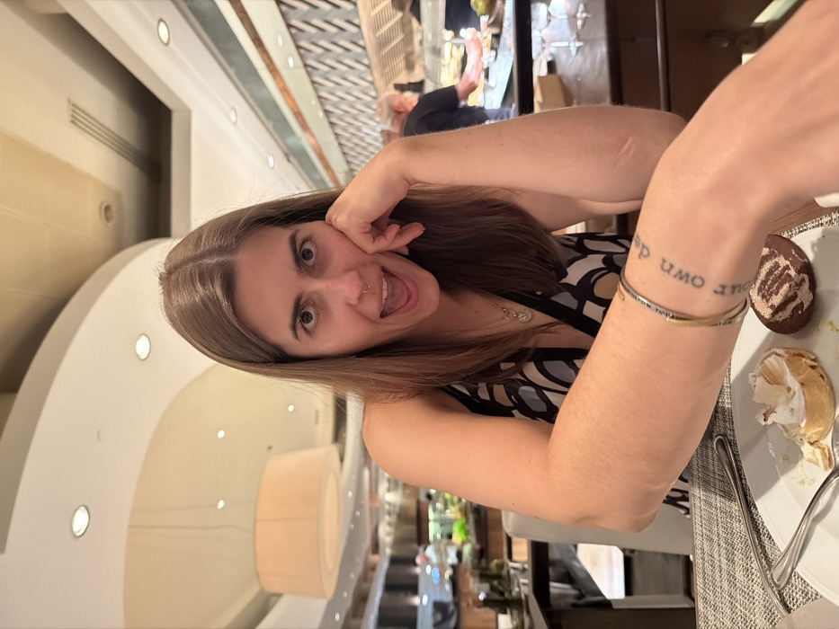 This image depicts a female individual seated at a dining table within the main restaurant of the Isrotel Dead Sea Hotel, Ein Bokek, Tamar Regional Council, Israel. The subject, a Caucasian female with long brown hair and a septum nose piercing, is looking directly at the camera with a wide-eyed, open-mouthed expression. She is wearing a black, white, and tan patterned sleeveless top and a necklace with a circular pendant. Her left hand rests against her cheek, while her right forearm, bearing a tattoo with text and two thin bracelets, is visible on the table. On the white plate in front of her are two partially consumed dessert items: a light-colored pastry, possibly a cream puff, and a dark, patterned cookie or small cake. A silver fork rests beside the pastry. The table is covered by a textured placemat. The background reveals a brightly lit, modern restaurant interior. To the left, a buffet area with various food stations and serving dishes is visible. To the right, an open kitchen features a male individual, likely a chef, wearing a black shirt and working behind a counter. Overhead, the ceiling displays multiple recessed spotlights and a large, drum-shaped pendant light fixture. The walls in the background feature distinctive wavy white and blue-grey patterned panels. Several empty wine glasses are visible on an adjacent table.