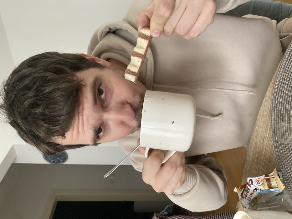 An adult Caucasian male with short brown hair and light facial hair is depicted indoors, looking directly at the camera. He wears a light beige hooded sweatshirt. His left hand holds a white ceramic mug with small dot patterns, a silver spoon protruding from it, which he is bringing to his mouth to drink. In his right hand, he holds a Kinder Bueno White chocolate bar, showing its white cream filling and wafer layers. On a wooden table in the foreground, an unwrapped Kinder Bueno package and a grey woven placemat are visible. The background consists of light-colored walls, a dark doorway to the left, and a blue and white decorative plate mounted on the upper left wall. The specific location within Budva, Montenegro, is not discernible from the image.
