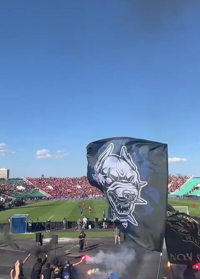 large crowd of people at a soccer game. The crowd is dense, and many people are waving their arms in the air. Several people are holding up flags and flares, creating smoke that obscures the view in places. The stadium is packed, with both sides of the field filled with spectators. The sky is blue, and the sun is shining brightly.