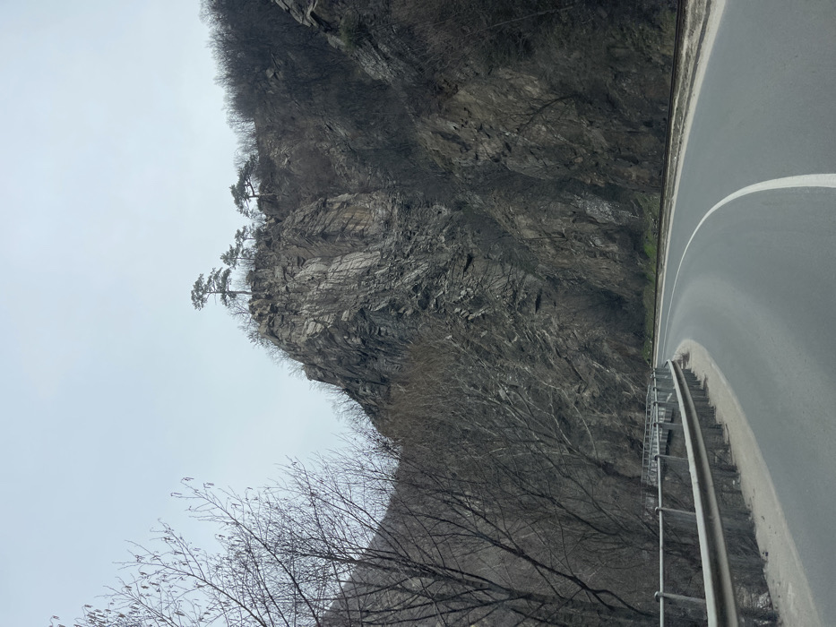 The image captures a mountain pass near Dorkovo, Bulgaria, under an overcast sky. A two-lane asphalt road with a solid white center line curves to the right in the foreground. A metal guardrail parallels the left edge of the road, behind which a metallic bridge-like structure with railings is partially visible. To the immediate right of the road, railway tracks run parallel to the road. The dominant feature is a steep, dark grey rocky cliff face on the right, displaying prominent geological stratification and fractures. The summit of this cliff is sparsely vegetated with several tall, slender evergreen trees. Both sides of the pass are densely covered with deciduous trees, currently bare of leaves, consistent with a late winter or early spring environment. No individuals or animals are present.
