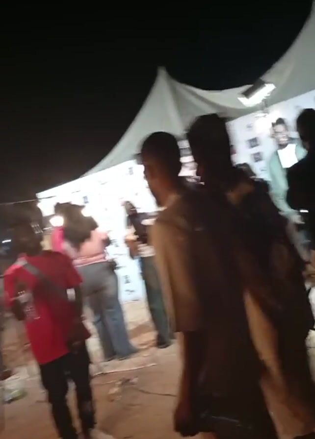The video captures a busy night scene at what appears to be a promotional event or gathering