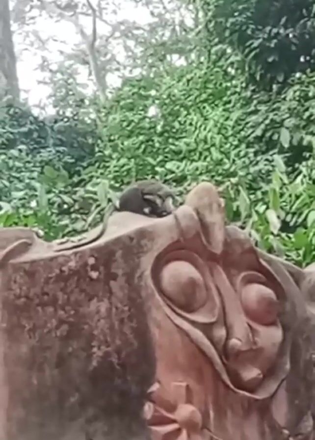 small primate, possibly a monkey, sitting atop a weathered, carved stone structure. The carving on the structure features a face with large, round eyes. The background consists of dense green foliage and trees under an overcast sky. The camera is relatively still, providing a static view of the scene. No people are visible.