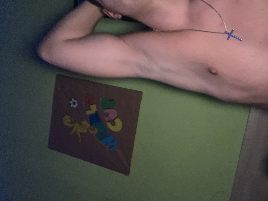 The scene is set indoors, within the city of Silistra, Bulgaria. The image depicts the upper torso and bent right arm of an adult male, exhibiting light skin. He is shirtless and wears a silver-colored chain necklace with a blue cross pendant. To the left, a lime-green wall is visible. A rectangular poster is affixed to this wall, featuring a brown background. The poster displays the yellow cartoon character Tweety Bird above the multi-colored, three-dimensional text "WORLD CUP," accompanied by a white soccer ball with black details. The ambient lighting appears dim.