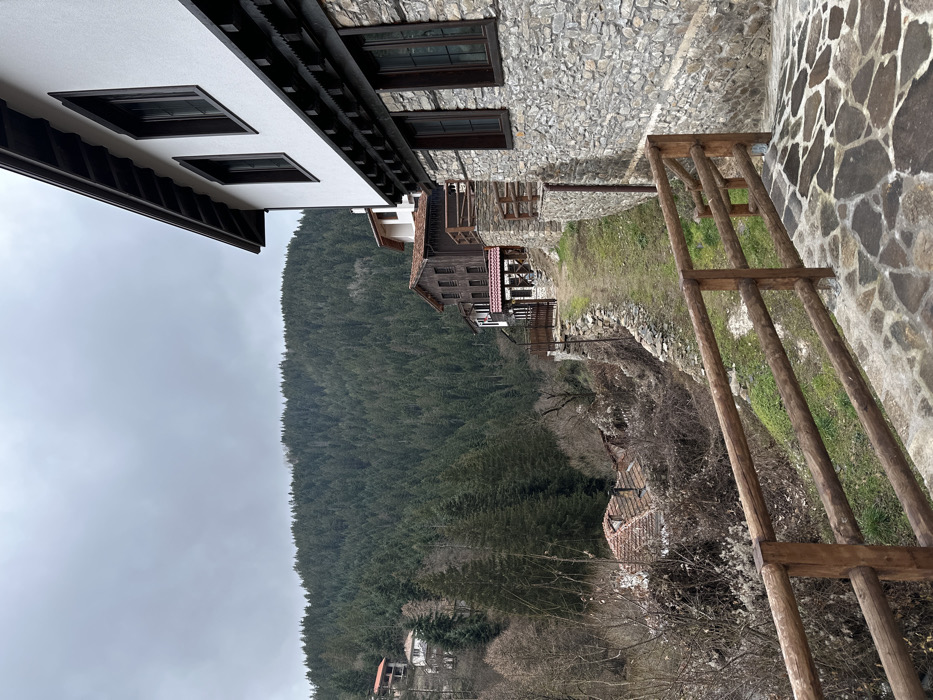 The image depicts a mountain village scene in Shiroka Laka, Bulgaria, under an overcast sky. In the foreground, a multi-toned flagstone patio transitions into a wooden rail fence, composed of three horizontal logs, extending left. Beyond the fence, a narrow dirt path ascends the hillside, bordered on its right by a low, dry-stacked stone wall. To the immediate right, a traditional two-story building stands with a lower foundation of irregular grey stone masonry and an upper facade of white stucco. Dark brown wooden window frames are visible on both levels, and a dark, intricately carved wooden eave system supports a dark roof. Further up the slope and to the left of this building, a brown wooden structure with a red tile roof features multiple windows, some with red awnings, indicating a possible commercial establishment or guesthouse. A smaller, white-walled building is partially visible behind it. The midground to the left of the ascending path shows a steep slope with sparse, dry deciduous vegetation, including several bare trees. Portions of residential buildings with red tile roofs are discernible lower on the slope. The background is dominated by a densely forested mountain, composed primarily of dark green coniferous trees, rising under a uniformly grey, cloudy sky. No individuals or active interactions are present within the frame.