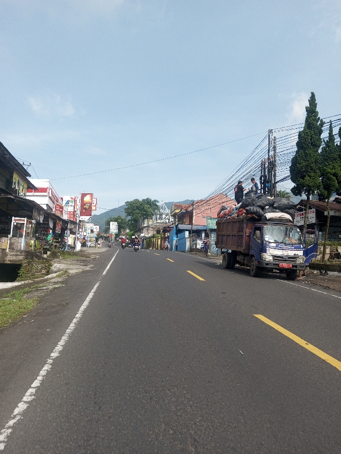 The scene depicts a sunlit view of a two-lane asphalt road in Thanthirimale, Sri Lanka, looking straight down the thoroughfare. The road is marked with a solid white line on the left edge and broken yellow lines indicating the center. On the right side of the road, a blue and brown utility truck, possibly a dump truck, is stationary on the shoulder. Its bed is heavily laden with numerous black sacks and various other items. Two adult males are positioned on top of the truck's cargo, one wearing a black shirt and the other a lighter-colored shirt, appearing to manage the load. Behind the truck, a series of utility poles supports a dense array of overhead power lines and cables, adjacent to several tall, slender evergreen trees. On the left side of the road, a dirt and grass shoulder runs parallel to a row of single-story commercial buildings featuring various storefronts and advertisements, including a partially visible "KFC" sign. Further down the road, several motorcycles are observed in motion or parked. In the mid-ground on the right, a white domed structure, possibly part of a religious building, is visible above the rooftops. Distant hills and green foliage form the background under a clear blue sky with scattered faint clouds.