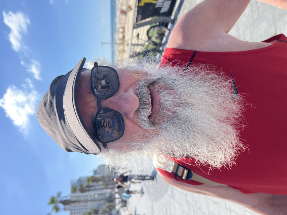 A close-up portrait shows an adult male standing on the Tel Aviv beachfront promenade under a bright, partly cloudy sky. The man, centered, has a prominent white beard and mustache, and is smiling, revealing teeth. He wears a dark brown baseball cap, black-framed sunglasses, and a red sleeveless athletic top with a faint black logo on the left chest. A beige strap from a backpack is visible over his right shoulder. The reflections in his sunglasses reveal the individual holding a smartphone, capturing the image, along with blurred figures and elements of the background environment. To the left, a paved section of the promenade extends into the distance, populated by blurred pedestrians and a person on a bicycle. This area is bordered by palm trees and modern, multi-story buildings characteristic of Tel Aviv's urban coastline. To the right, beyond a dark metal railing, lies a sandy beach featuring several white lounge chairs and sun umbrellas. The Mediterranean Sea is visible in the background, meeting the horizon under a light blue sky with scattered white clouds. A bicycle is parked near the railing, and a portion of a black sign with yellow lettering is also discernible.