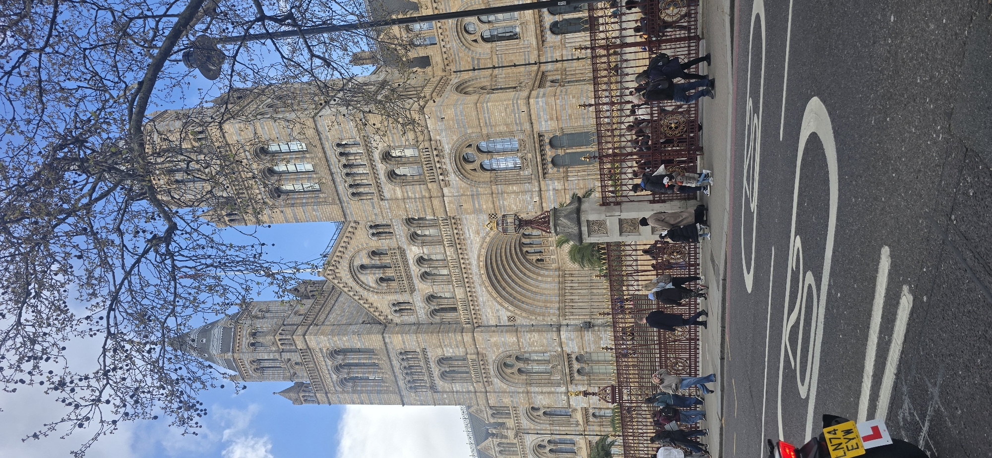 The image captures the Natural History Museum in South Kensington, London, United Kingdom, viewed from across Cromwell Road. The prominent subject is the museum's Victorian Romanesque Revival facade, constructed from light-colored stone with distinctive horizontal banding of darker stone. The building features multiple arched windows, elaborate stonework, two prominent towers (one with a conical roof on the left, partially obscured by tree branches, and another on the right), and a grand central arched entrance. In the midground, a dark reddish-brown metal fence with gold decorative accents separates the museum grounds from the public sidewalk. Stone pillars, one topped with an ornate lantern, are integrated into the fence line. A diverse group of approximately 20-30 pedestrians is visible on the sidewalk in front of the fence and further back within the museum grounds, walking or standing. The foreground shows a section of asphalt road with white painted markings, including a clear "20" speed limit indicator and parallel lines. The rear of a black motorcycle or scooter is visible on the far left, displaying a yellow UK license plate "LN74 EYW" and a red 'L' plate, signifying a learner driver. Overhead, bare tree branches with numerous dark, spherical seed pods (likely from a London Plane tree) frame the upper portion of the image, partially obscuring the museum towers and the partly cloudy blue sky. A dark streetlamp is visible on the right, behind the tree branches. The scene is illuminated by natural daylight.