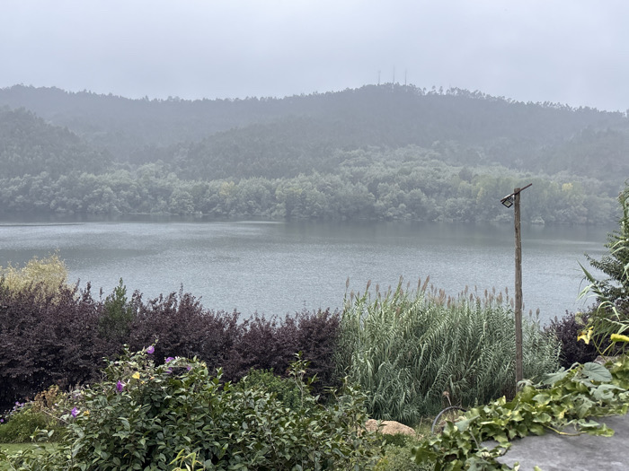 The image presents a wide outdoor view of a natural landscape in Gondomar, Portugal, under an overcast, misty sky. The scene is devoid of human figures or direct human activity. In the foreground, occupying the lower third of the frame, is a varied arrangement of vegetation. On the immediate bottom right, a segment of a flat, light-gray stone surface or wall is visible, partially covered by green ivy-like vines. Directly above this, and extending across the lower portion of the image, are numerous shrubs and plants. These include dense clusters of dark reddish-purple foliage interspersed with greener shrubs, some featuring small, light-purple flowers. Towards the center-right, a thick patch of tall, reedy, light-green plants with feathery tops stands prominently. Positioned among this vegetation, slightly right of the vertical center, is a weathered wooden post supporting a dark-colored, rectangular outdoor light fixture angled upwards. At the base of the post, partially obscured by the reedy plants, a metallic bicycle wheel and a portion of its frame are discernible. The midground is dominated by a calm body of water, likely a river or reservoir, stretching horizontally across the frame. Its surface reflects the muted gray light of the sky, showing slight ripples. The far bank of the water is densely forested with a continuous line of green trees. In the background, rolling hills covered with extensive forest rise gradually. The distant hills are partially obscured by atmospheric haze or mist, blending into the light-gray, featureless sky. Faintly visible on the crest of the furthest hill, towards the upper right, are several indistinct structures resembling communication towers or power line pylons. The overall lighting suggests a uniformly diffused, low-light condition, characteristic of an overcast day.