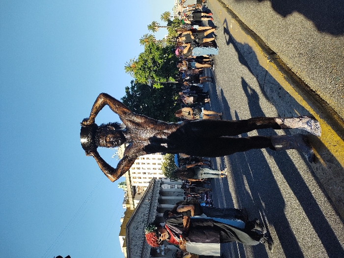 A full-bodied sculpture of a nude human figure stands at a public space with people milling around. The figure is dark and appears to be metallic with a pail or bowl held above the head. The shot is taken at a low angle, with the sky and buildings visible in the background, along with silhouettes of the spectators' shadows on the road. A person with bright hair and a colorful headdress stands in the foreground, adding to the vibrant atmosphere.