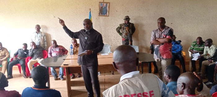 A meeting is in progress with several seated men, a man standing at a table giving a presentation, and another man standing with arms crossed. An armed soldier stands in the background, near a wall with a framed image and a flag. A water bottle is visible on the table, and one of the attendees in the foreground has "PRESSE" printed on their shirt.