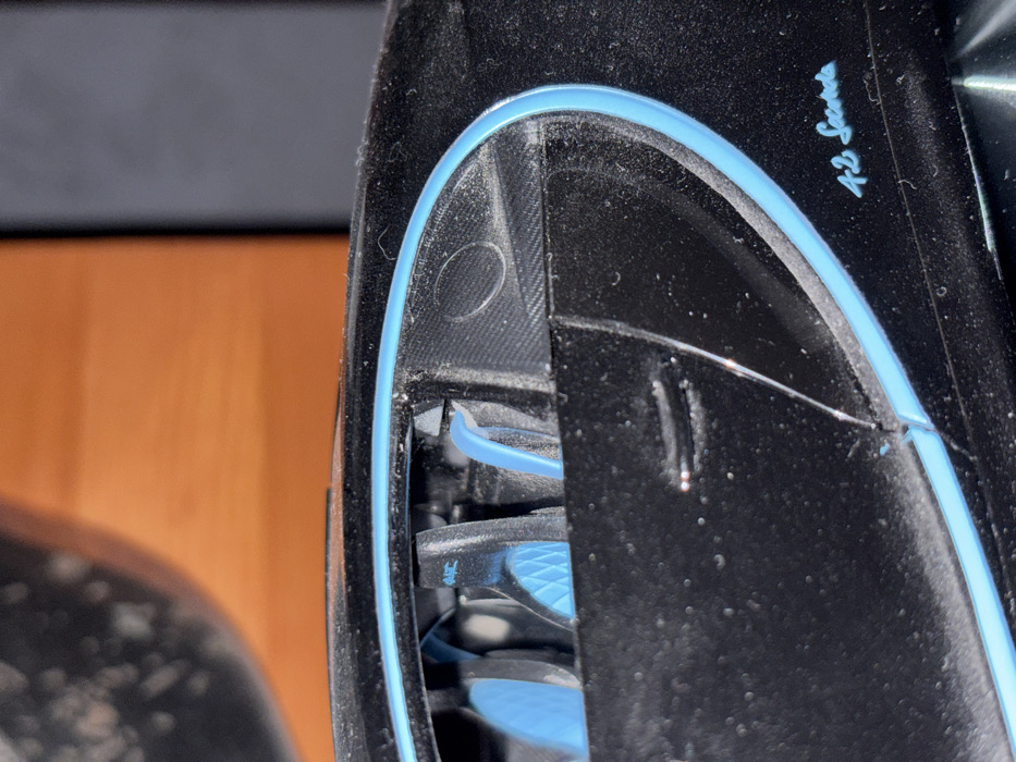 The scene is located in Meistratzheim, France. The image presents a close-up, high-angle view of a dusty, black scale model car, identified as a Bugatti Chiron. The vehicle features light blue accent lines outlining the side window and extending around the rear section of the cockpit. Visible through the open side window are two black bucket seats with light blue, diamond-quilted upholstery on the cushions. A small, cursive inscription reading "42 Seconds" in light blue is present on the black rear quarter panel. The entire surface of the model is coated with a fine layer of dust. Two subtle horizontal indentations are visible on the side panel, indicative of a door handle. A circular depression is located on the interior panel behind the side window. The background is out of focus, comprising a dark, indistinct object in the upper left, a blurred orange-brown surface (likely wood) in the mid-right, and a dark grey vertical element on the far right. No individuals, actions, or specific interactions are depicted.