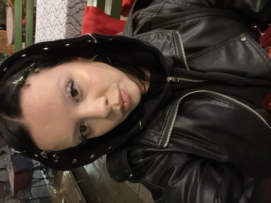A person with fair skin, brown eyes, and pierced lip is seen in a close-up shot. The person wears a black hoodie with metallic embellishments and a black leather jacket. The image is slightly tilted. The person looks into the camera. Background includes soft textures of furniture and a hint of red fabric.