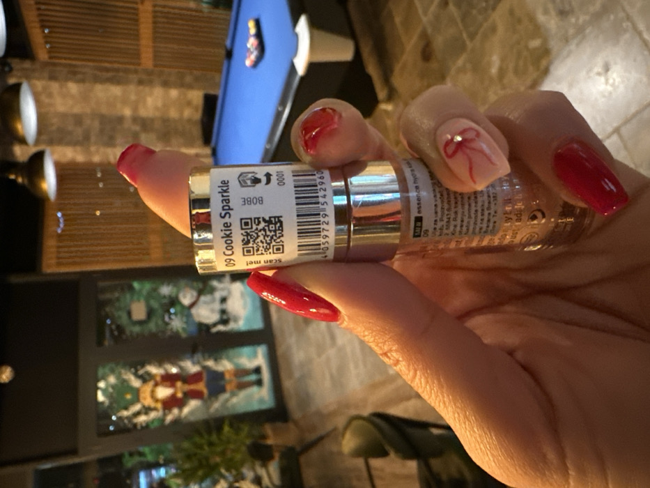 A hand holds a bottle labeled "09 Cookie Sparkle" with a barcode. The bottle is clear with a silver top and contains a light peach-colored liquid. The hand has red and nude-colored nails, with a small red bow painted on one nail. The background includes a blurred pool table, interior design, and what appears to be a decorated window or display featuring a Santa Claus figure.