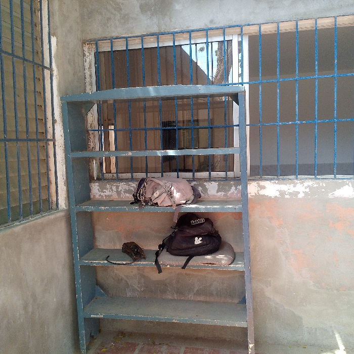 The image displays an exterior or semi-enclosed area in Juan Griego, Venezuela. A light blue, four-shelf vertical storage unit, exhibiting chipped paint and wear, stands against a worn concrete wall. On the top shelf rests a light-colored, possibly beige, soft bag or backpack. The second shelf from the top holds a black backpack, featuring a light-colored logo, positioned on a grey cushion-like object. To the left on the same shelf is a small, dark, irregularly shaped object. The two lowest shelves are empty. In the background, a large window with blue security bars is visible, reflecting a distant structure and partial foliage. A narrower window with similar blue bars is present on the left side of the frame. The surrounding walls are concrete, displaying signs of age and discoloration. The ground appears to be a paved or tiled surface with minor debris. No individuals are present in the scene.