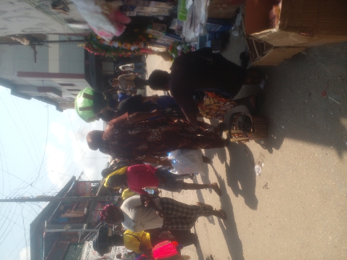 This image captures a busy, sunlit street scene in Satellite Town, Nigeria