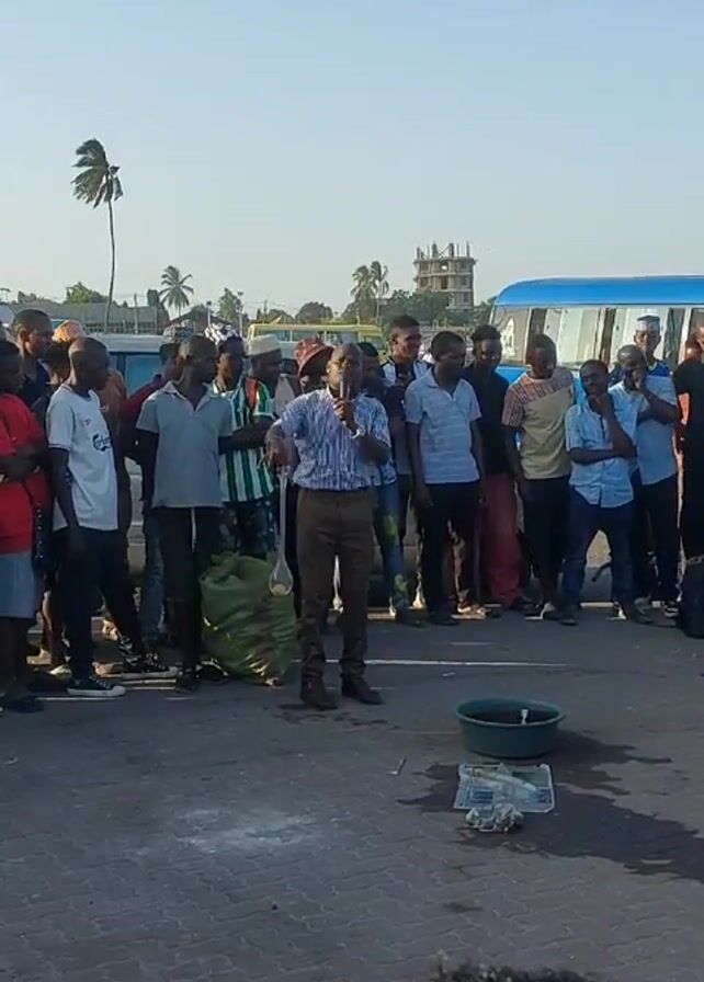 A man standing in front of a crowd of people speaks into a microphone. He is wearing a blue and white checkered shirt and brown pants, and he is holding a spoon. A bag, a bowl, and some loose papers are visible on the ground in front of him. Another man approaches the speaker with a bottle in his hand. Palm trees and buildings are visible in the background, and a blue bus is parked nearby. The video is shot during the daytime in an open, paved area.