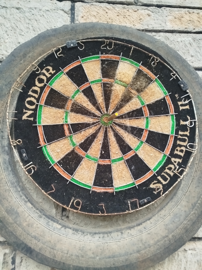 - "A worn dartboard, labeled "NODOR SUPABULL II", is mounted inside a used tire on a stone wall" by FM-gef792, licensed under CC BY 4.0