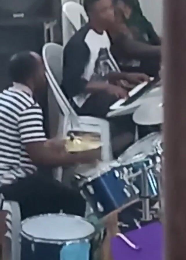 A low-quality video shows three men playing musical instruments. One man is drumming, wearing a black and white striped shirt. Another man in a white and black baseball tee is seated playing keyboard. Another man is standing behind him, partially blocked from view. A large black speaker is present in the background. The room appears to be indoors and brightly lit.