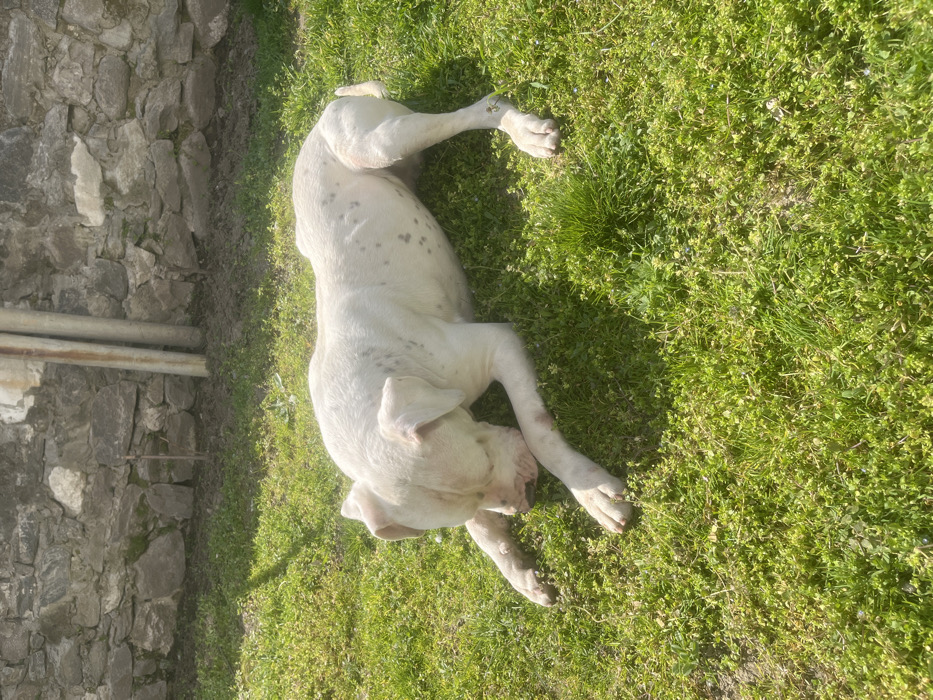 - "A large, white dog with short, cropped ears and sparse dark spots on its torso is observed lying on its stomach on a brightly illuminated green grassy surface" by FM-Wb4f32, licensed under CC BY 4.0