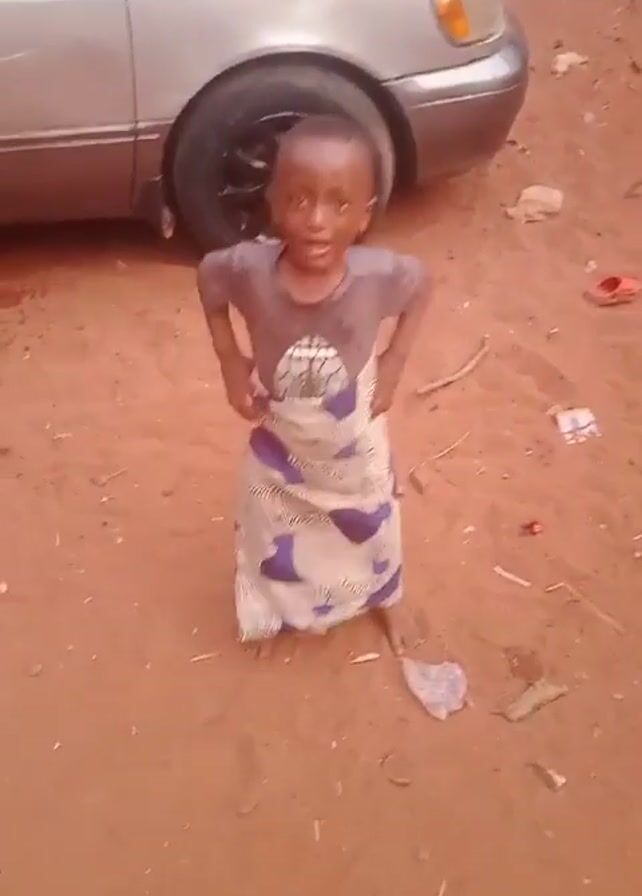 A young child stands in a dirt yard in front of a silver car, wearing a gray t-shirt and a patterned blue and white cloth wrapped around their waist. The child is looking at the camera and appears to be speaking or shouting. The ground is reddish-brown dirt with some scattered trash, leaves, and other small objects. The car is parked close behind the child.