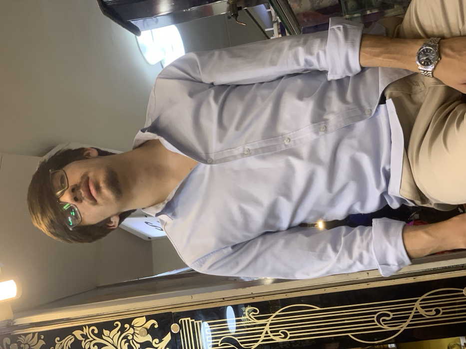 A young male is depicted from a low angle, looking directly at the viewer. He has dark hair, a light mustache and goatee, and wears rectangular eyeglasses. His attire consists of a light blue button-up shirt with sleeves rolled past the elbows, khaki trousers, and a silver-toned wristwatch on his left wrist. The indoor setting includes an ornate dark vertical panel with gold scrollwork on the left, and a dark, reflective surface with a metallic tap on the right. Artificial light sources are visible overhead and to the left. The scene is located in Barza Municipality, Syria.