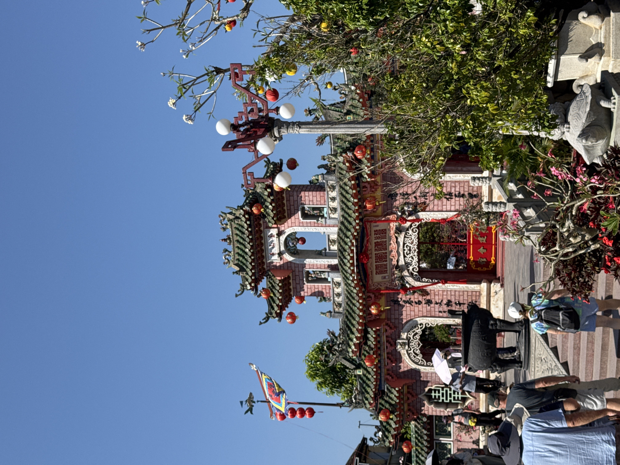 Japanese Covered Bridge in Hội An Ward, Vietnam. The bridge has a pink facade, a green tiled roof, and is adorned with red lanterns. A street light with white globe lamps is visible on the left. A tree grows to the right of the bridge. Pedestrians are walking across the bridge. The sky is clear and blue.