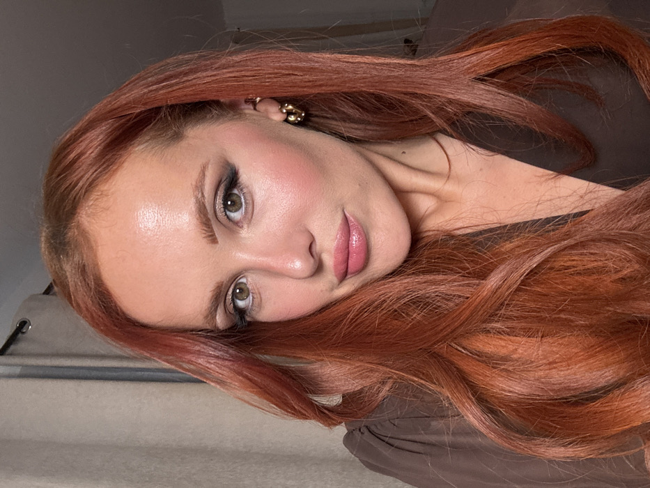 A woman with reddish-brown hair poses at a tilted angle. Her skin has a radiant glow, enhanced by makeup featuring smoky eyeshadow, blush, and glossy lips. She wears a gold ear cuff. Her gaze is directed slightly upward, and her expression is serene. The background is muted, drawing focus to her face and hair. She wears a brown top.