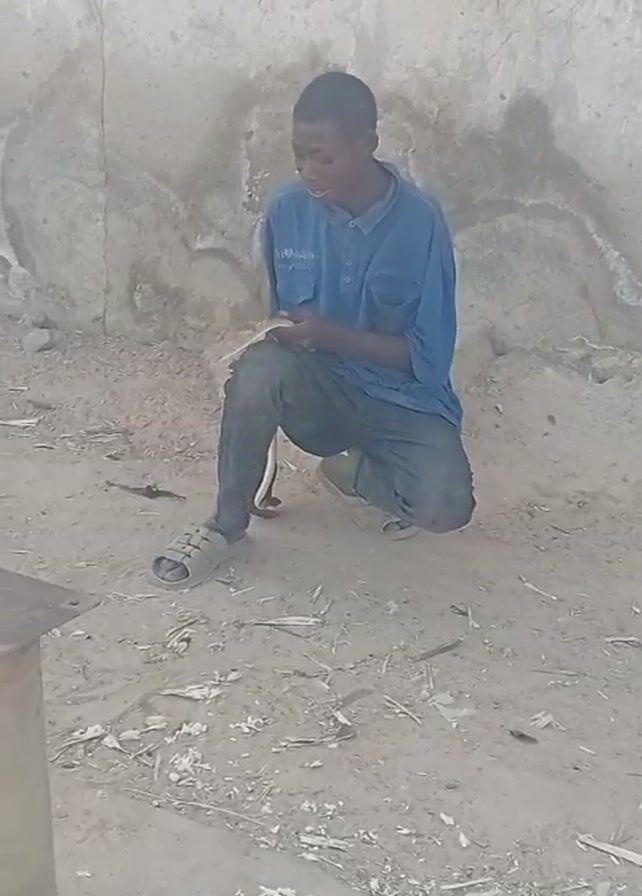 A young person is squatting on the ground. They are wearing a blue button-down shirt, grey pants, and sandals. They are holding a white object in their hands, possibly a small book or a piece of paper. The person looks up and smiles. They are outdoors, on a ground covered in sand and small pieces of wood. There is a concrete wall behind them, with some writing or markings on it. A metal object with a square base is visible on the ground to the left of the person. The video is slightly out of focus at times.